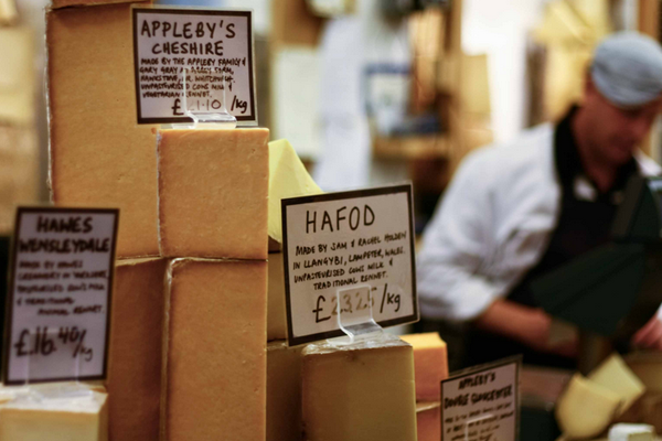I had a day off last week to squire my brother and sister-in-law around Southwark, as they have flown in from the States. The first thing we did was make a beeline to Neal’s Yard Dairy on Park Street, weaving our way through Borough Market. I am gratified to see that every time I take this route, there are more cheese makers and artisanal dairy types plying their trades in this key attraction under the arches. So, we got into the shop and enjoyed tasting cheeses (and then buying them, of course) with a server from… Boston, US. Which is where I think Randolph’s drive to spread the word of British cheeses is working so well.