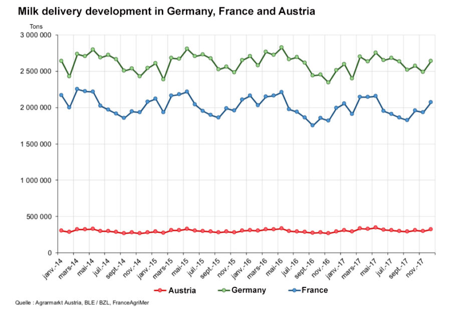In Germany, in June 2016, the price of conventionally produced cow’s milk reached a long-standing low in Germany. For the first time the German delivery volume was lower than in the same month of the previous year. From this time on also in the year 2017 the deliveries decreased compared to the previous year.